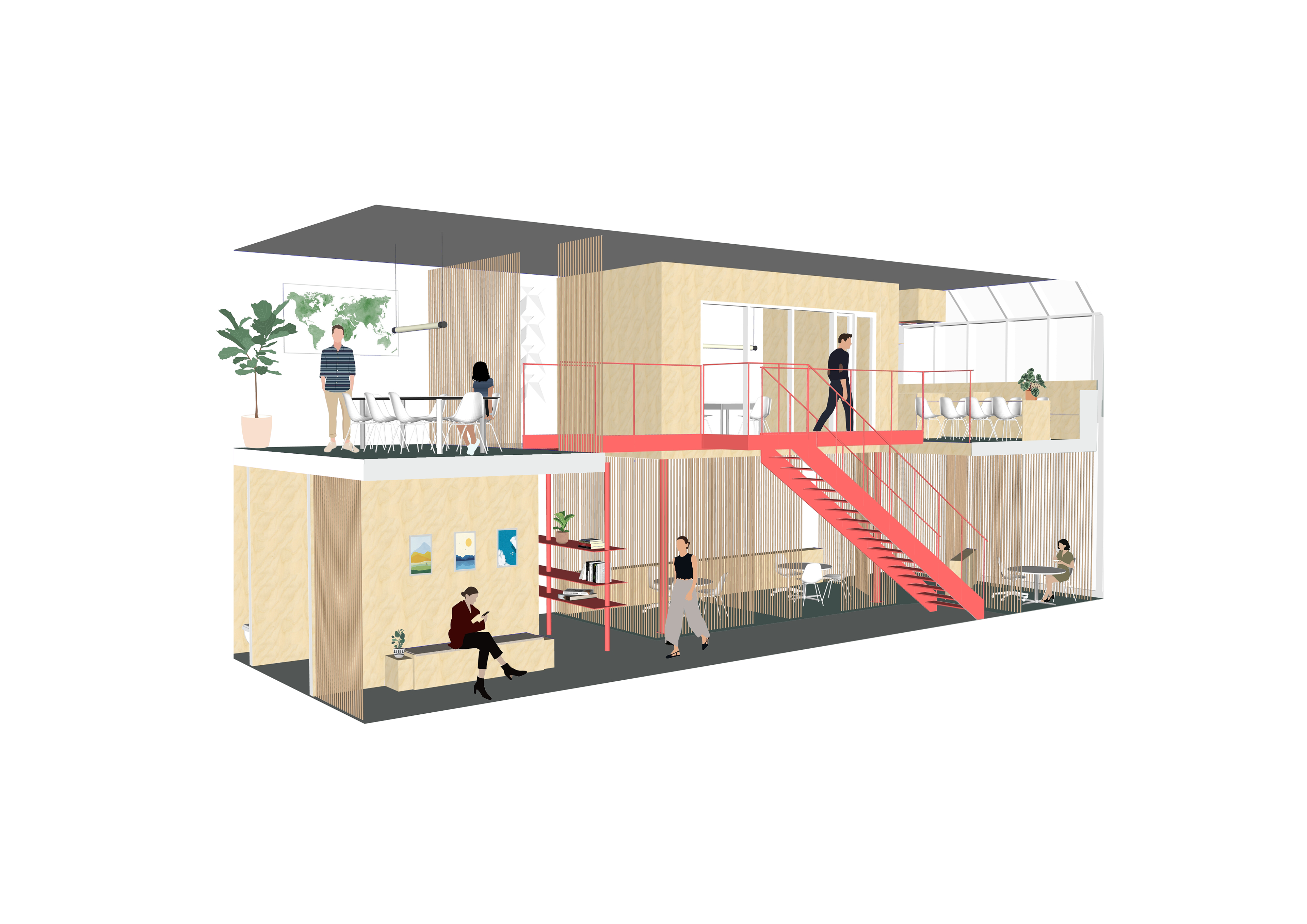 Bridge is een reisbureau dat zich richt op avontuurlijke reizen. Het interieur benadrukt dit thema door het gebruik van opvallende kleuren en natuurlijke materialen. Als afscheiding zijn touwen toegepast, waardoor de privacy van de klant behouden blijft, terwijl er toch voldoende lichtinval is. Daarnaast versterken deze touwen het avontuurlijke karakter van het ontwerp. Omdat de gevel van het pand grotendeels uit ramen bestaat, wordt de aandacht van voorbijgangers getrokken door de felrode trap en brug. Ook focust het ontwerp zich op het welzijn van het team dat hier werkzaam is. Zo is er een ruime keuken voorzien waar medewerkers kunnen ontspannen, maar die ook geschikt is voor het volgen van workshops. Daarnaast is er een loungenet ontworpen dat uitnodigt om samen tot rust te komen en informeel samen te zijn.